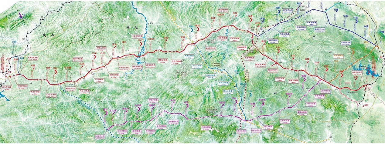 荊門至安康鐵路起自焦柳鐵路的當(dāng)陽(淯溪)站,經(jīng)遠(yuǎn)安、保康、房縣、竹山、竹溪、利縣,終至安康樞紐襄渝線的月河站,線 路全長約為396.28km (其中橋梁全長80.48km,隧道全長176.78km,橋隧總長257.26km,橋隧比64.92%)。為國家I級鐵路,估算總額221.05億元。