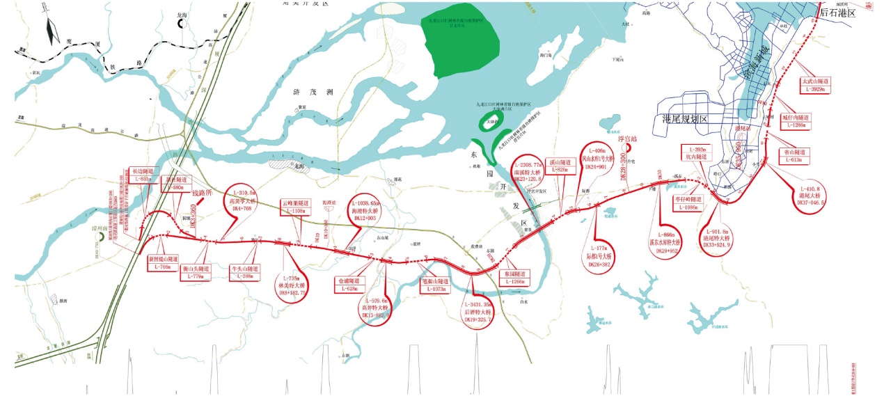 該鐵路位于福建省漳州市漳浦縣境內(nèi),北起在建廈深鐵路漳浦站,向南經(jīng)杜潯鎮(zhèn)至古雷鎮(zhèn),是漳州港港口集疏運(yùn)及臨港工業(yè)的重要后方通路,是漳州市港口鐵路支線布局中的重要組成部分,正線全長41.2km,上行疏解線4.335km,為國家Ⅱ級(jí)鐵路,投資總額為21億元。