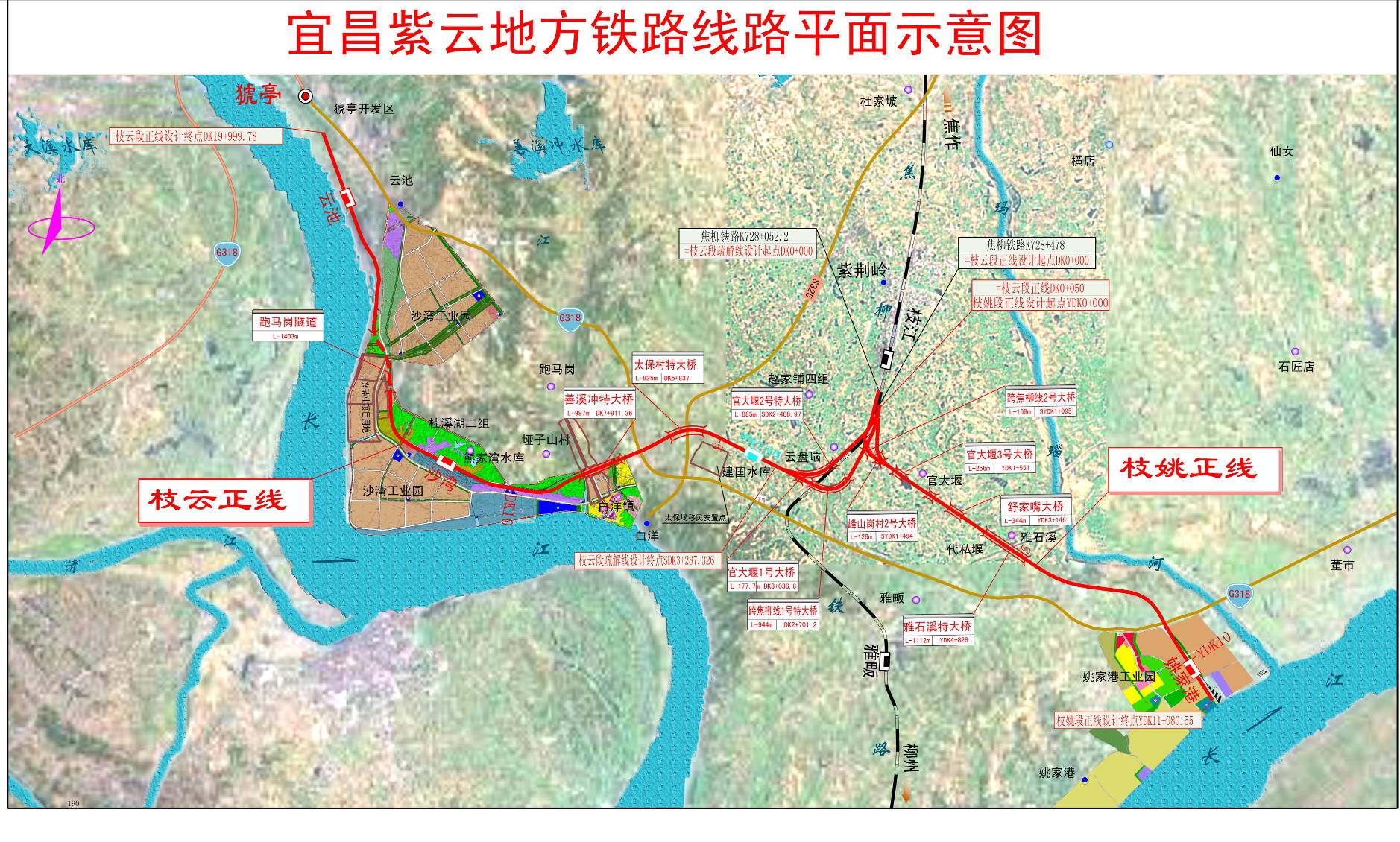 宜昌紫云地方鐵路為宜昌三峽綜合交通體系的重要組成部分。該鐵路位于湖北省宜昌市境內,在焦柳線枝江站接軌后分別沿東、西方向延伸至姚家港及云池港,線路全長36.7公里,分為枝云段和枝姚段。該鐵路于2018年年底通過初步驗收并開通運營。