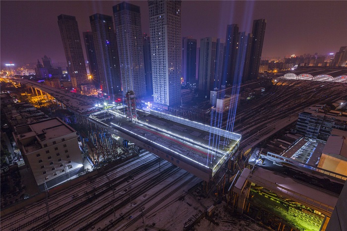 常青路(三環線~青年路)工程規劃為城市快速路,全線采用高架橋加地面輔道形式進行建設。主線高架橋在漢口候車站西咽喉跨越京廣漢口聯絡線、滬蓉、漢丹等多條鐵路線9股道。本橋施工方案采用轉體法施工。受外部因素控制,本橋為極不對稱轉體,遠離漢口站側轉體長度為43.8m,靠近漢口站側轉體長度為91.4m,轉體重量約8600噸,轉體角度81°。